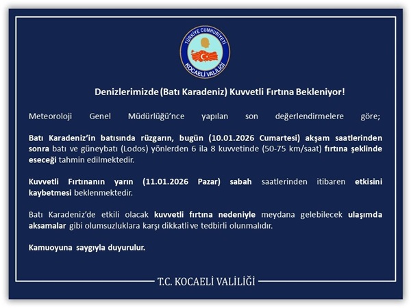 Kocaeli Valiliği tarafından yapılan yazılı açıklamada şu ifadelere yer verildi; “Meteoroloji Genel Müdürlüğü’nce yapılan son değerlendirmelere göre; Batı Karadeniz’in batısında rüzgarın, bugün (10.01.2026 Cumartesi) akşam saatlerinden sonra batı ve güneybatı (Lodos) yönlerden 6 ila 8 kuvvetinde (50-75 km/saat) fırtına şeklinde eseceği tahmin edilmektedir. Fırtınanın yarın (11.01.2026 Pazar) sabah saatlerinden itibaren etkisini kaybetmesi beklenmektedir. Batı Karadeniz’de etkili olacak kuvvetli fırtına nedeniyle meydana gelebilecek ulaşımda aksamalar gibi olumsuzluklara karşı dikkatli ve tedbirli olunmalıdır.”